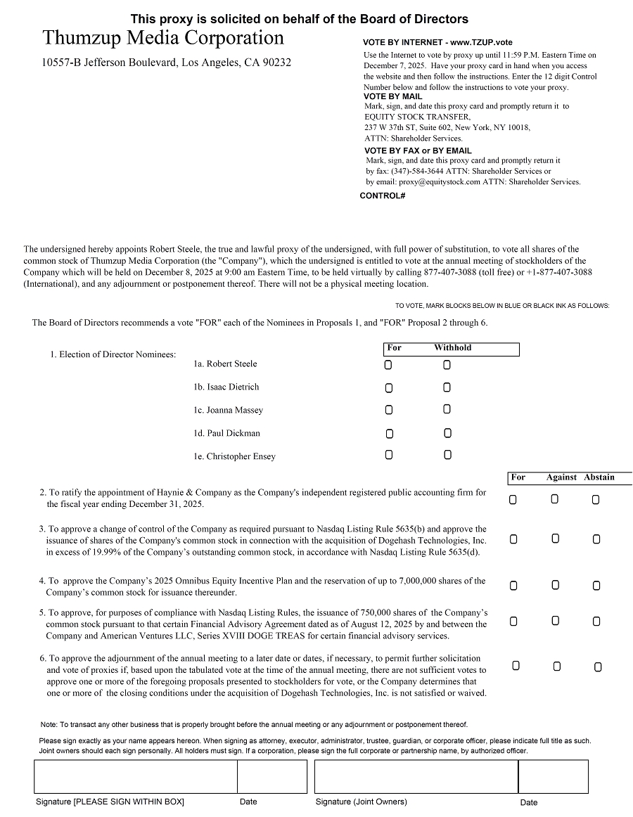You are invited to attend the 2025 annual meeting of stockholders (together with any adjournment, postponement, or other delay thereof, the “Annual Meeting”) of Thumzup Media Corporation, Inc., a Nevada corporation (the “Company”, “Thumzup” or “TZUP”) to be held on December 8, 2025 at 9:00 a.m. Eastern Time. The Annual Meeting will be held in a virtual-only meeting format by calling 877-407-3088 (toll free) or +1-877-407-3088 (International). For details, see the Notice of Meeting which follows. Capitalized terms and words are defined in the certain section titled, “Definitions” on page 1 of this proxy statement.