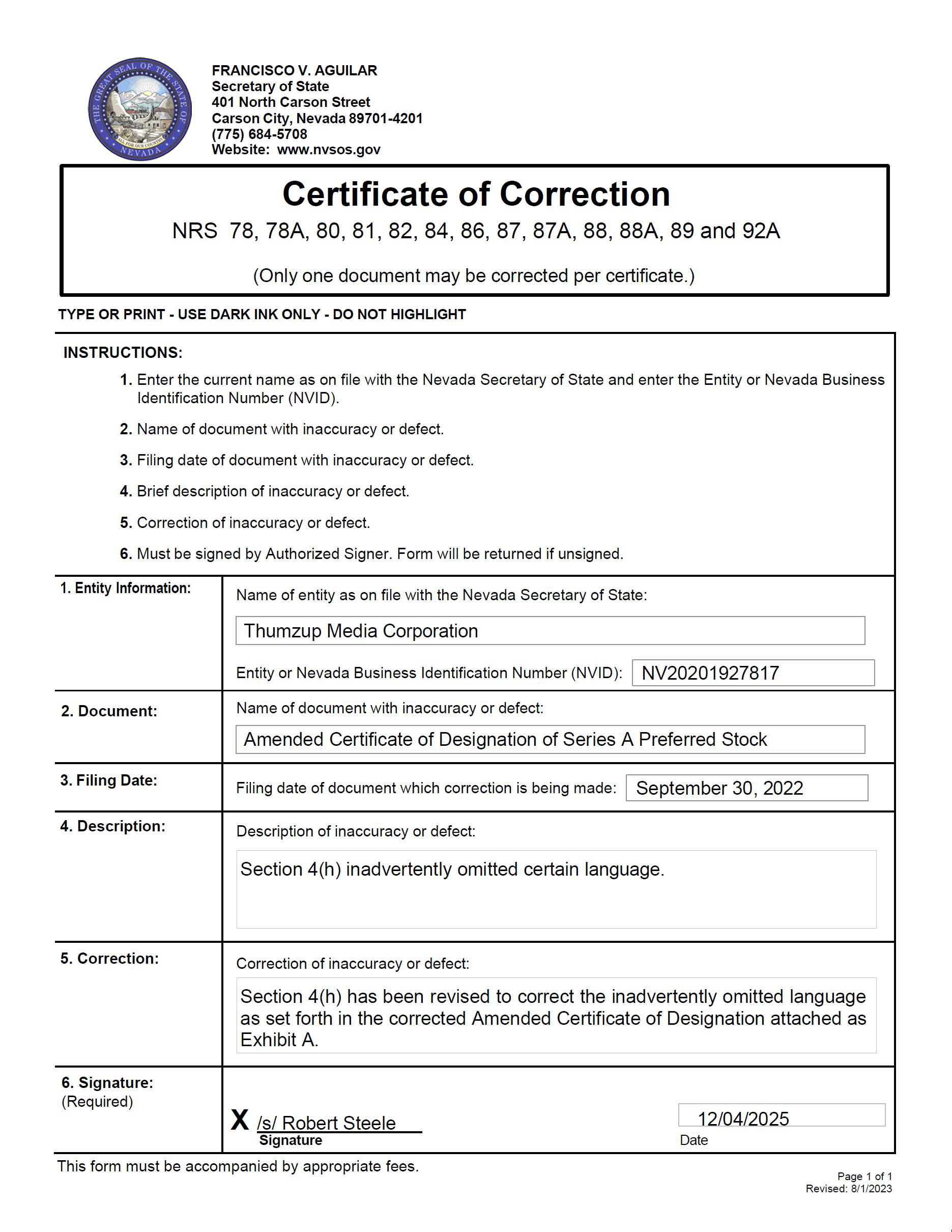 I, Robert Steele, hereby certify that I am the Chief Executive Officer of Thumzup Media Corporation (the “Company”), a corporation organized and existing under the Nevada Revised Statutes (the “NRS”), and further do hereby certify:
